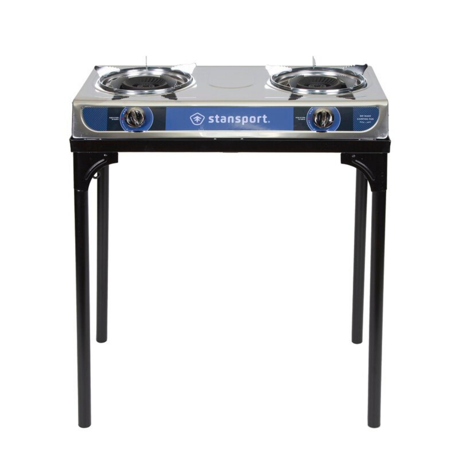 This Gourmet Double Burner stove is the PERFECT stove for any disaster situation. It uses a large propane tank for continuous use. No small tanks to keep changing out. It stands as well for easy use.